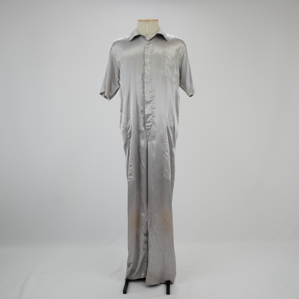 by Michelle Araujo Leia Mais...Macacão utilitário prateado de manga curta, três bolsos aplicados frontais, dois bolsos traseiros, elástico no centro costas e fechamento em seis botões em vista embutido
