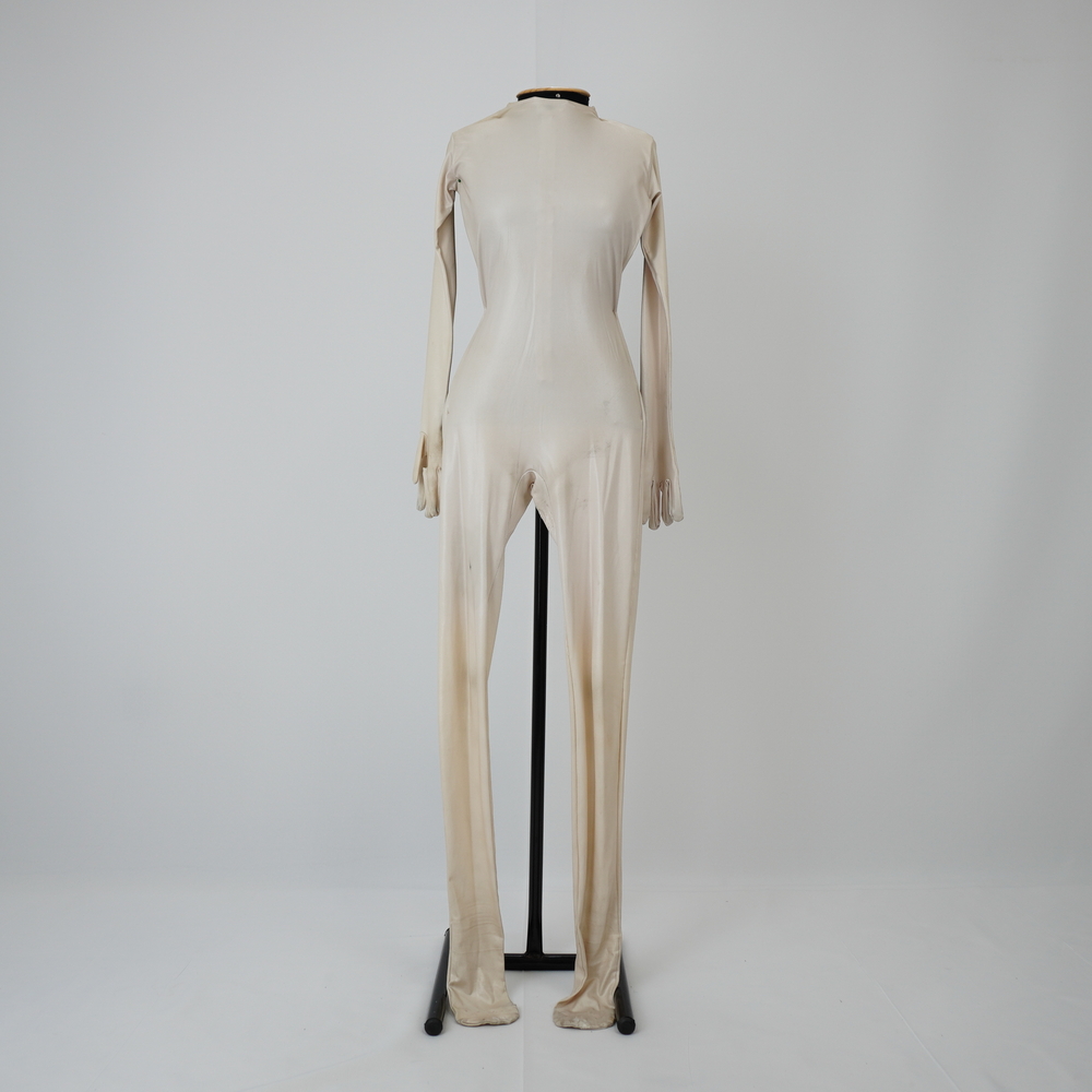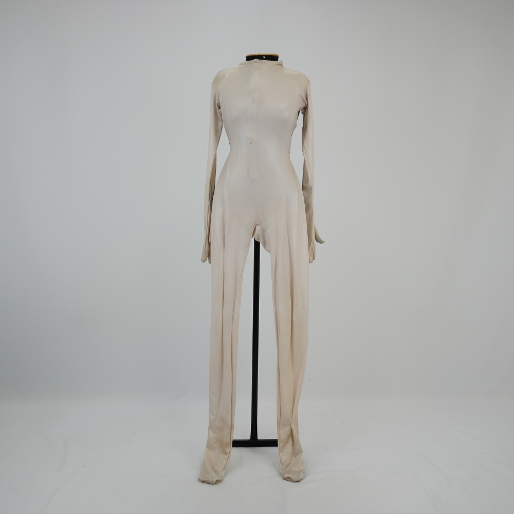 by Michelle Araujo Leia Mais...Macacão bege perolado (inteiro descascado o prata), justo ao corpo, manga longa com luva e pézinho, fechamento com zíper no centro costas