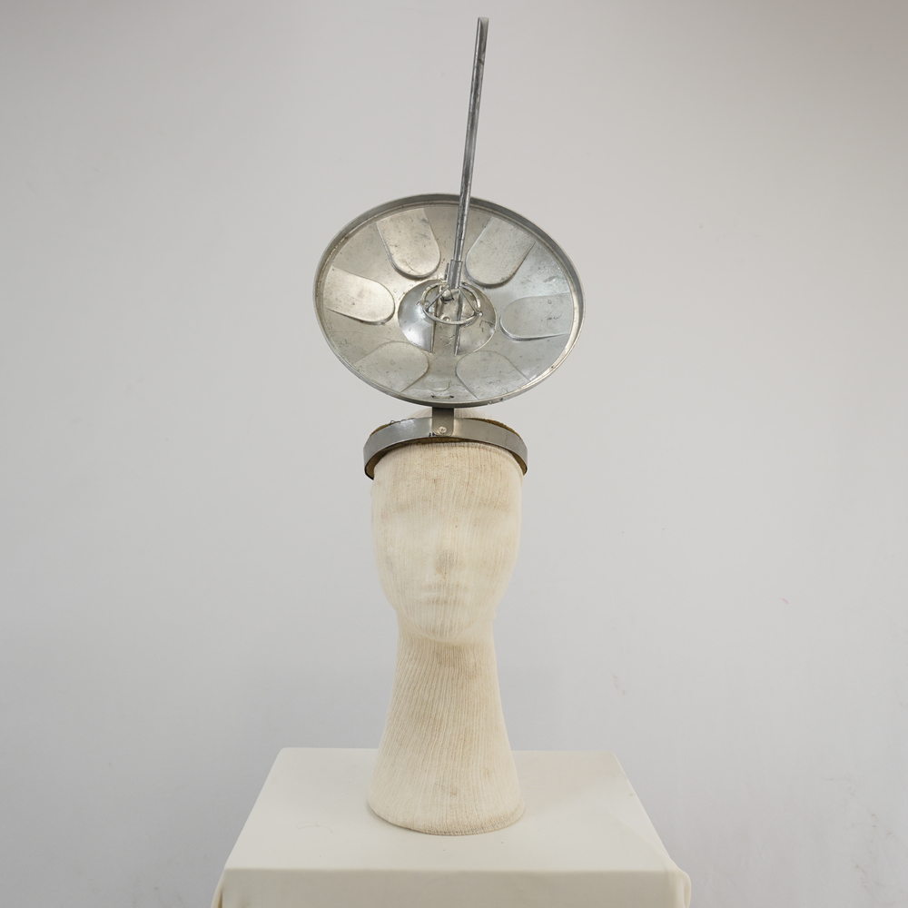 by Michelle Araujo Leia Mais...Adereço de cabeça prateado com antena parabólica acoplada e junção com a base da cabeça forrada com espuma
