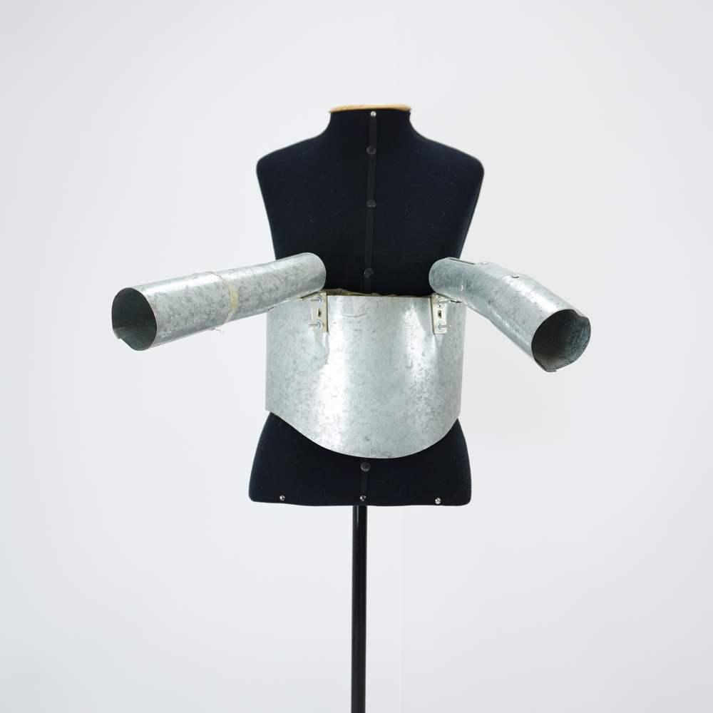 by Michelle Araujo Leia Mais...Cinturão de metal prateado com interno com espuma, fivela de ajuste com cadarço preto na parte traseira, com 3 estruturas cilindrícas em cada lado do busto simulando os...