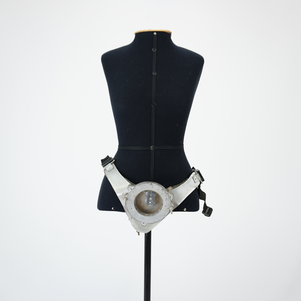 by Michelle Araujo Leia Mais...Calcinha base de espuma e externo metálico prata com estrutura frontal circular com luz, laterais com cadarço preto e fivela plástica preta