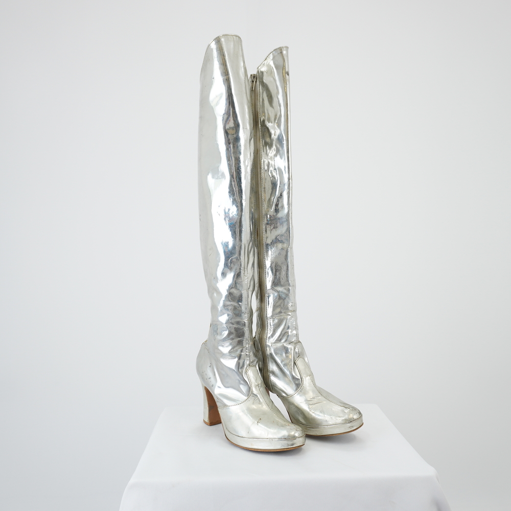 by Michelle Araujo Leia Mais...Par de bota prata acima do joelho, salto com 10 cm de altura de grossura média e abertura em zíper na lateral interna do sapato