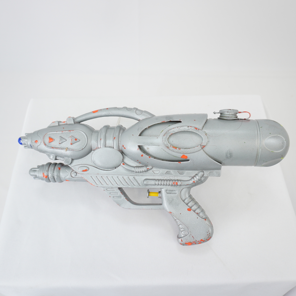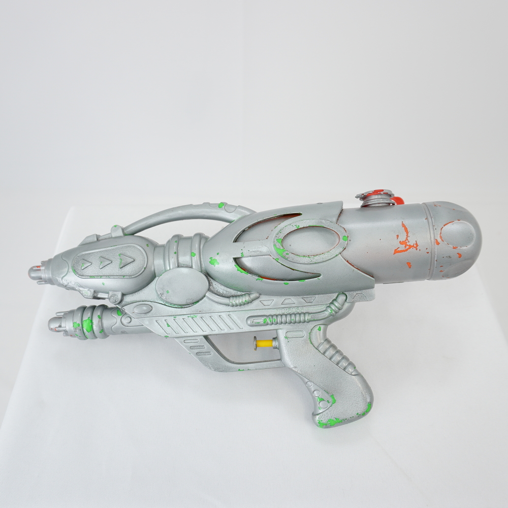 by Michelle Araujo Leia Mais...Arma de água de brinquedo pintada com tinta prateada, com azul, laranja e verde como as cores originais