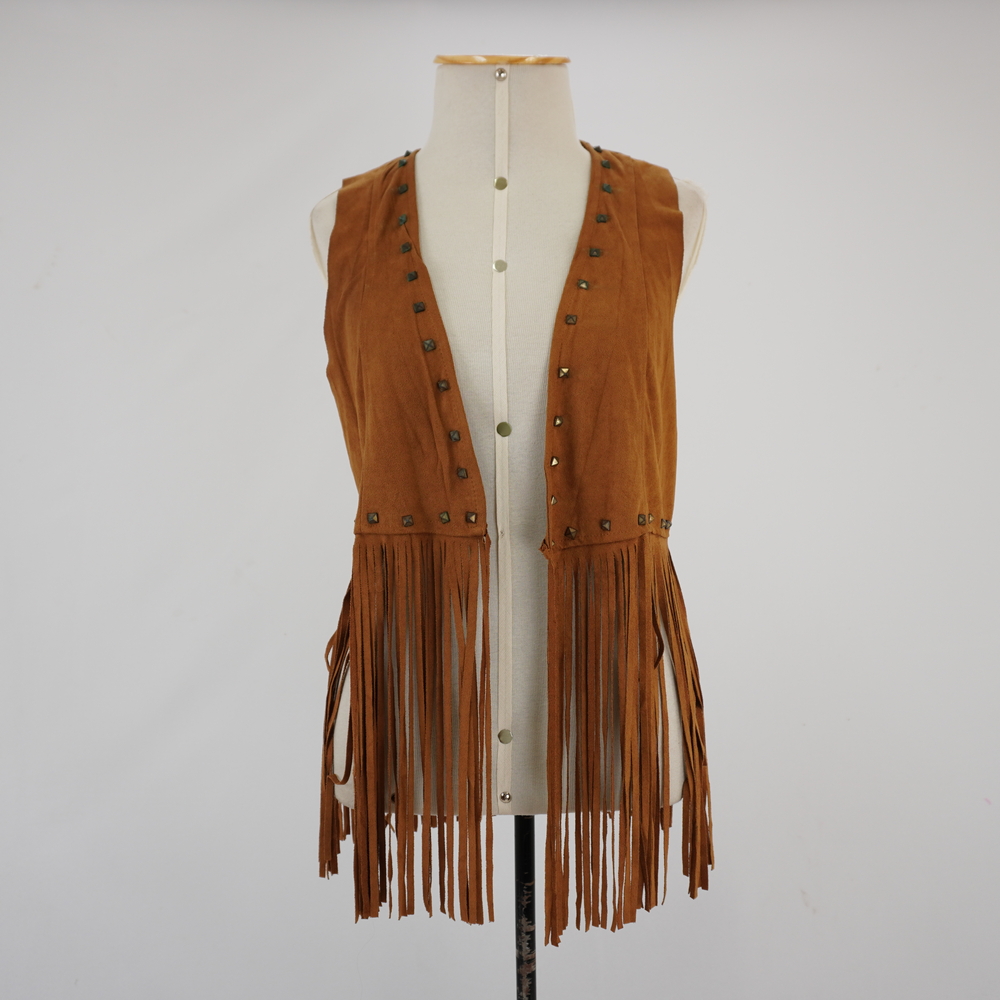 by Michelle Araujo Leia Mais...Colete caramelo com spikes metálico ouro velho de formato pirâmide aplicados por todo decote e barra frontal, cava a fio e barra com franjas