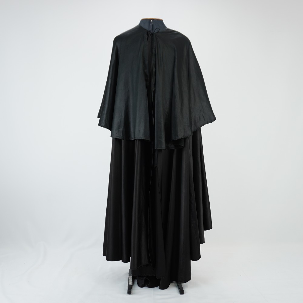 by Michelle Araujo Leia Mais...Capa preta longa com sobrecapa mais curta e fechamento com amarração no pescoço