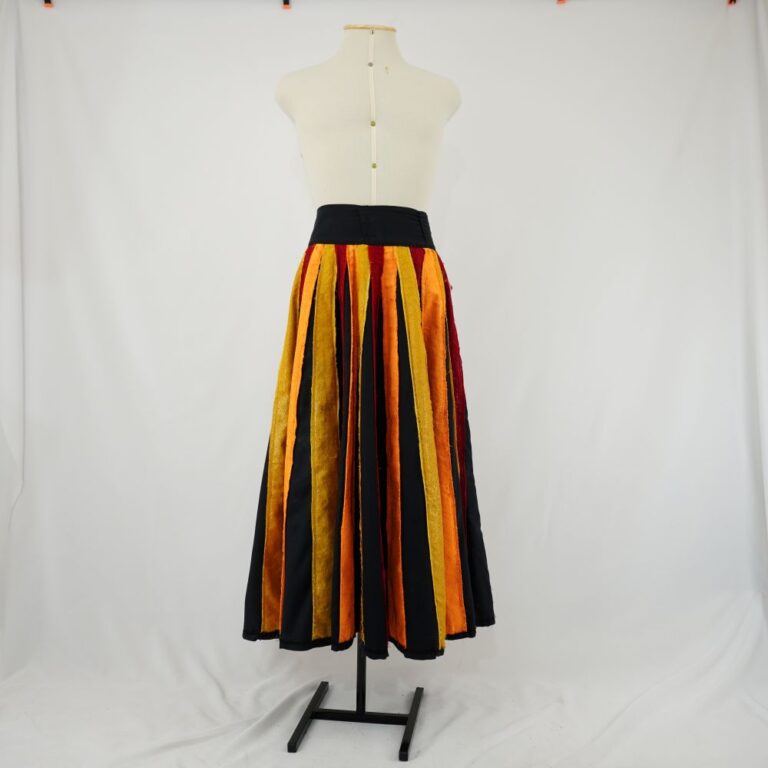by Michelle Araujo Leia Mais...Saia godê longa, dupla face, um lado preto liso com costuras pretas e do outro lado com faixas verticais em tecido brilhante com lamê nas cores laranja, vermelho...