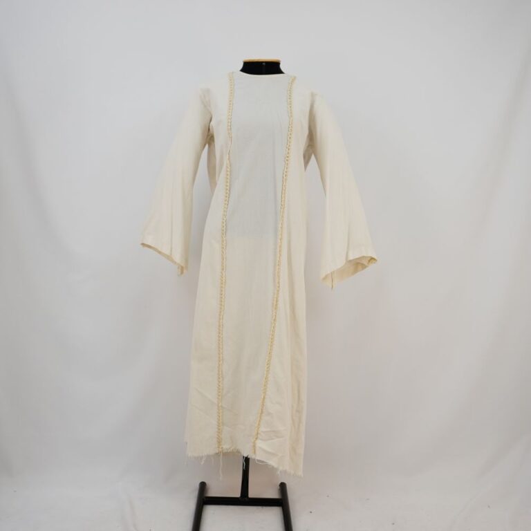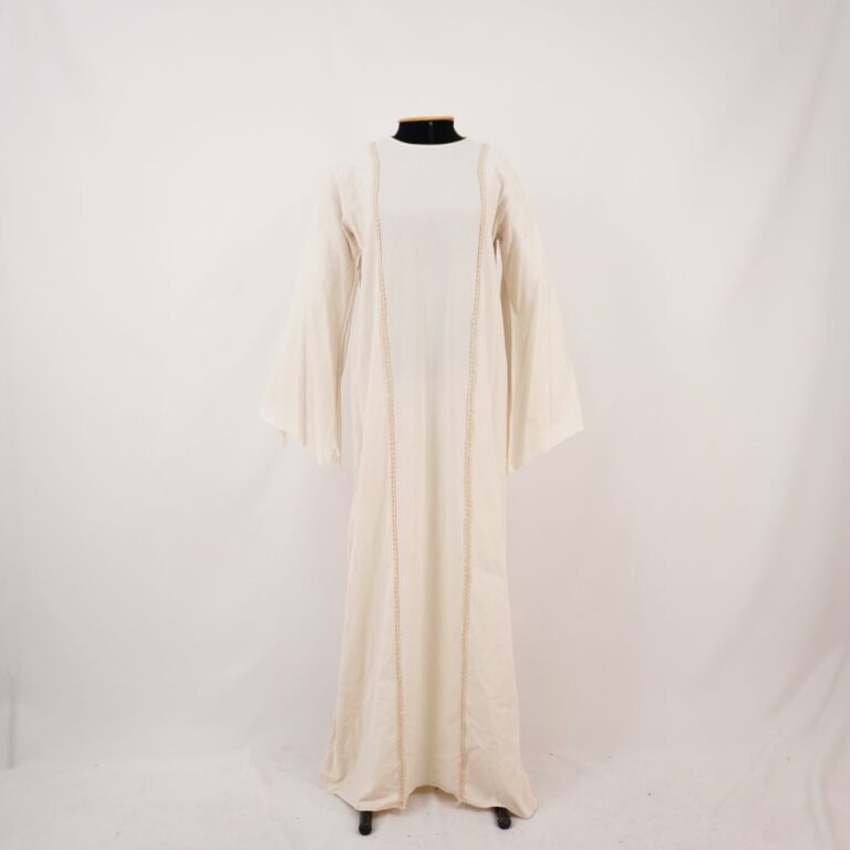 Vestido bege claro longo com manga longa pendente, aplicação dupla de passamanaria na frente