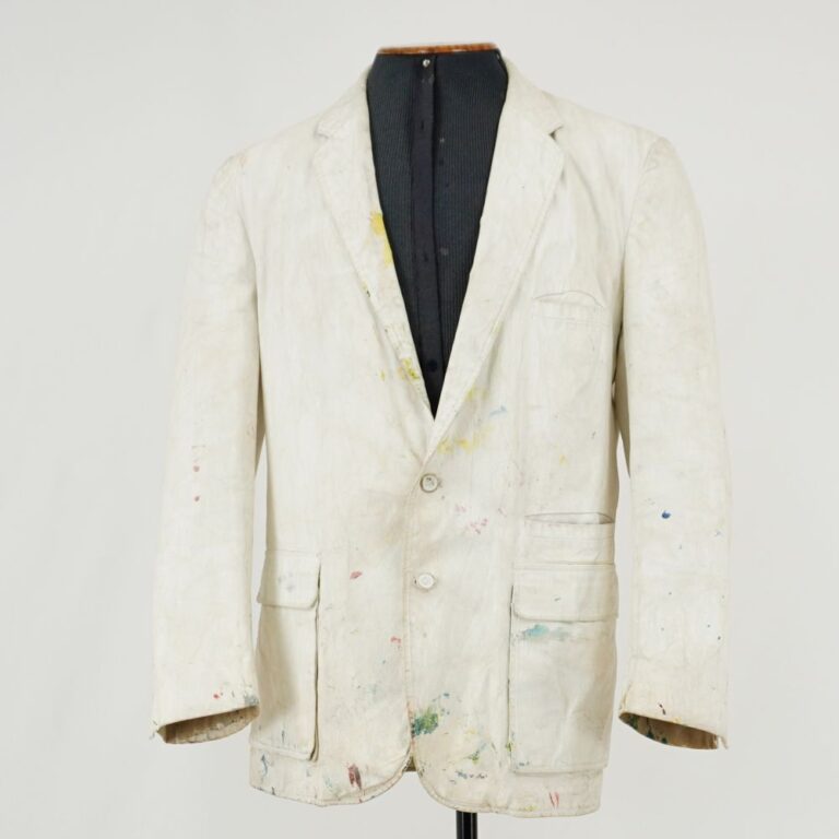 by Michelle Araujo Leia Mais...Blazer branco pintado com tinta branca e respingos de tinta colorida, fechamento em botões de plástico, com três bolsos frontais