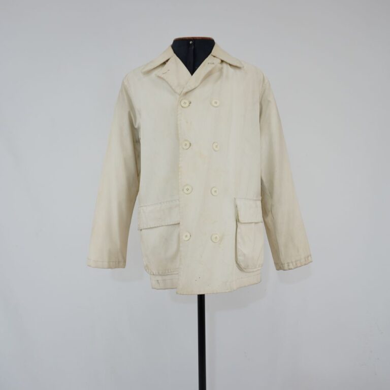 by Michelle Araujo Leia Mais...Blazer off white, dois bolsos frontais, vista dupla com botão de plástico, aparenta ser impermeável