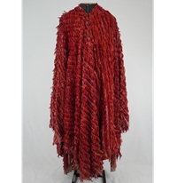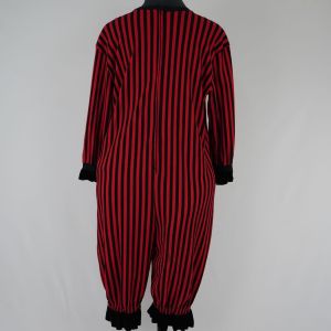 agosto 15, 2025 by Michelle Araujo Leia Mais...Macacão listrado vermelho e preto com babados em veludo preto nas mangas e nas barras.