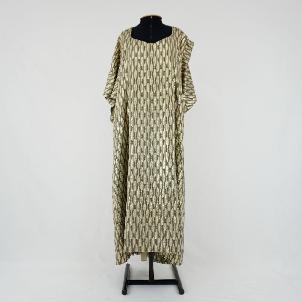 by Michelle Araujo Leia Mais...Vestido de jacquard dourado brocado, mangas godê medias. Corte evasê com detalhes de renda transparente nas costas e nesga na parte de trás da barra