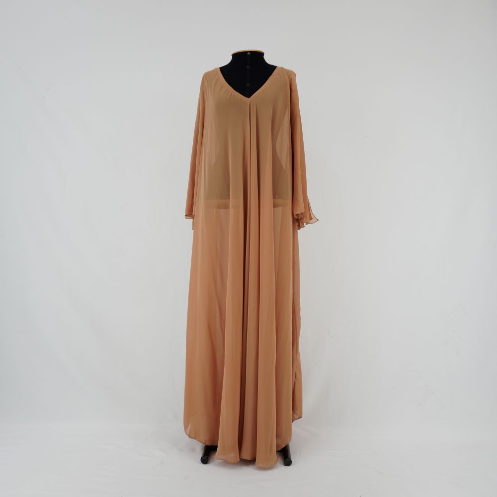 by Michelle Araujo Leia Mais...Vestido marrom longo, sem manga, tecido fluido, gola V, com uma falsa manga que cai nas laterais, modelagem godê