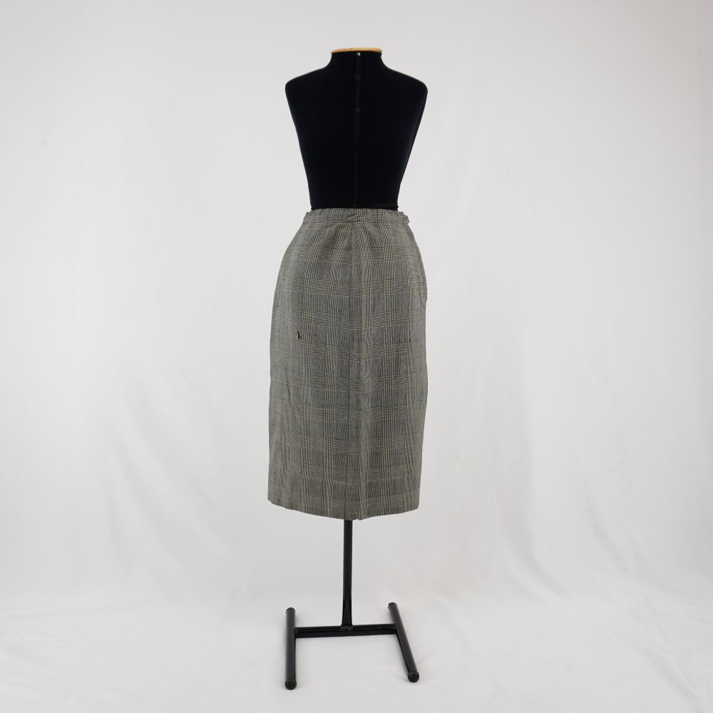 by Michelle Araujo Leia Mais...Saia longuete tubinho com padronagem Príncipe de Galles, prega fêmea na barra da lateral esquerda, fechamento em zíper de metal e botão de plástico