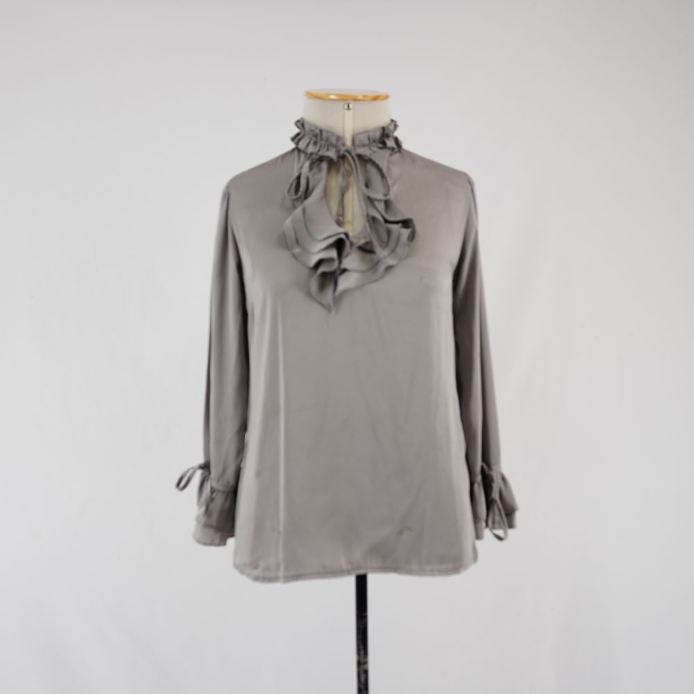 by Michelle Araujo Leia Mais...Blusa cinza manga longa bufante, três camadas no punho e no decote com gola franzida, amarração no decote e punho, duas pences de busto e botão de pressão...