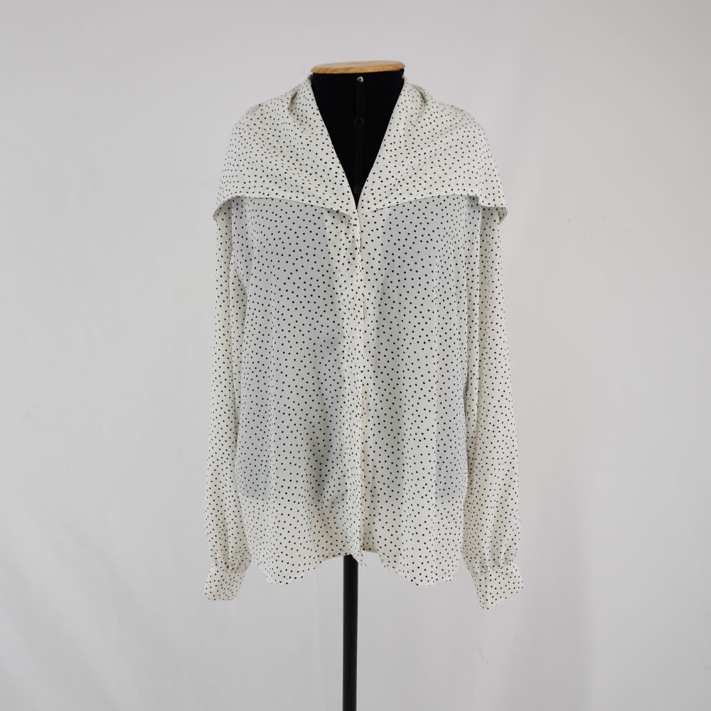 by Michelle Araujo Leia Mais...Camisa manga longa branca com estampa de poá preta, gola puritana com prega na nuca, fechamento em um botão forrado à vista e três de plástico em vista...