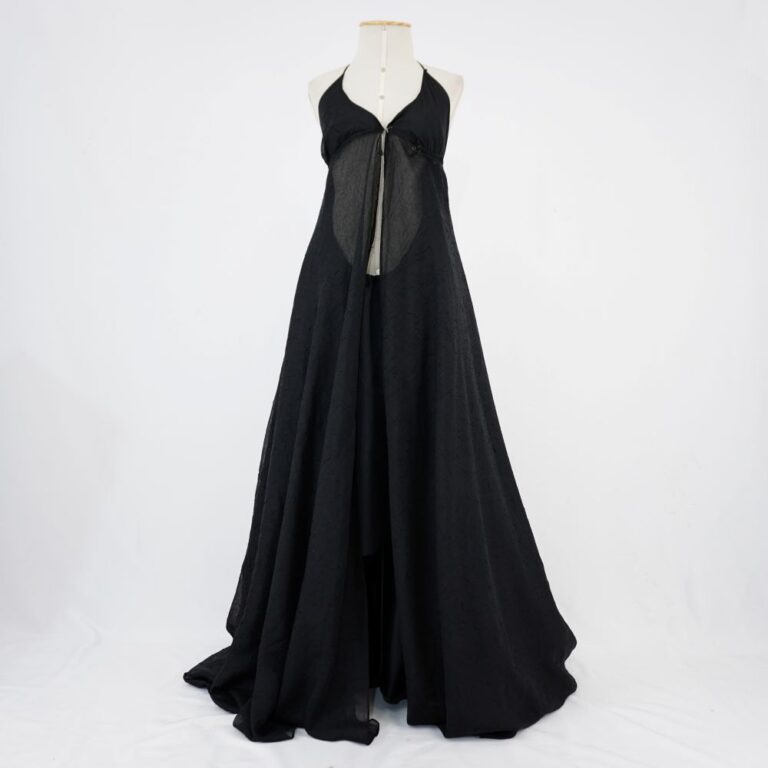 by Michelle Araujo Leia Mais...Vestido longo preto com cauda. Frente única com amarração no pescoço feito em camadas alternantes entre transparência e acetinada. Fechamento com 1 colchete de gancho frontal.