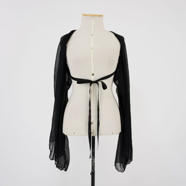 by Michelle Araujo Leia Mais...Bolero preto de manga longa ampla com transparência. Fita de gorgurão preta com amarração frontal.