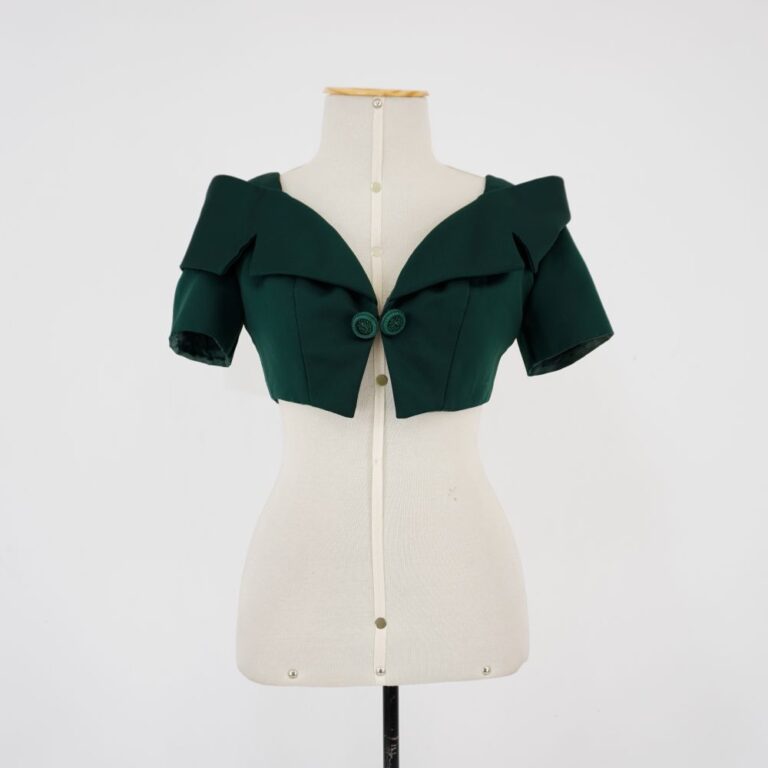 by Michelle Araujo Leia Mais...Bolero de manga curta verde esmeralda forrado com gola baixa tipo canoa. Fechamento em colchete de gancho e aplicação de 2 botões ornamentais.