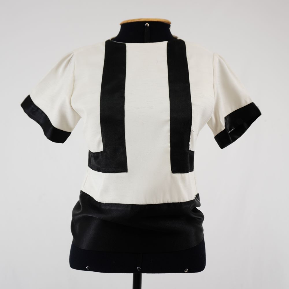 by Michelle Araujo Leia Mais...Blusa manga curta branca com barra da blusa e da manga em preto. Aplicações em formato geométrico em tecido prato na parte frontal. Fechamento em zíper no centro...