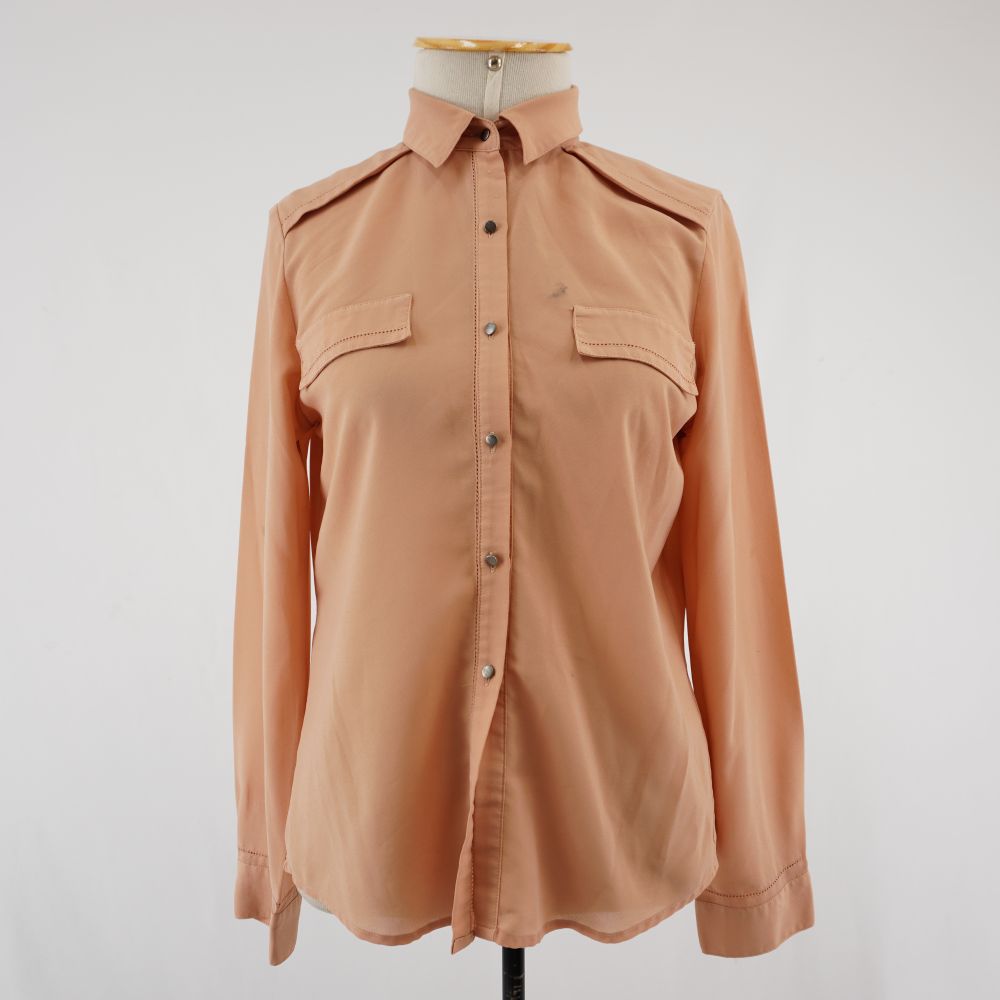 by Michelle Araujo Leia Mais...Camisa manga longa com transparência na cor rosa, duas abas de bolso falso na parte frontal e detalhe de aba nos ombros. 4 pregas nas costas, fechamento frontal...