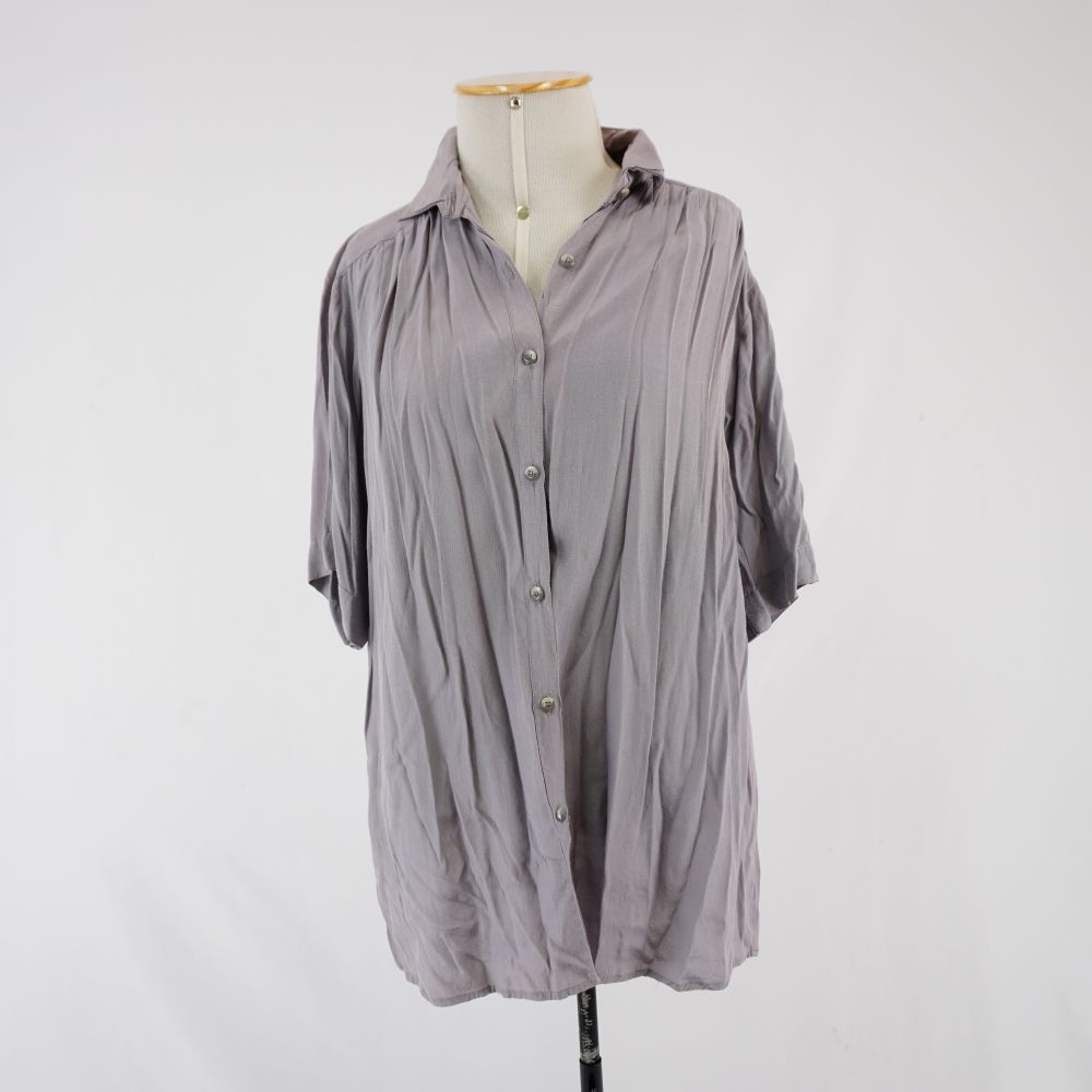 by Michelle Araujo Leia Mais...Camisa manga curta cinza arroxeada, pregas frontais e uma prega fêmea no meio costas, fechamento em sete botões de plástico