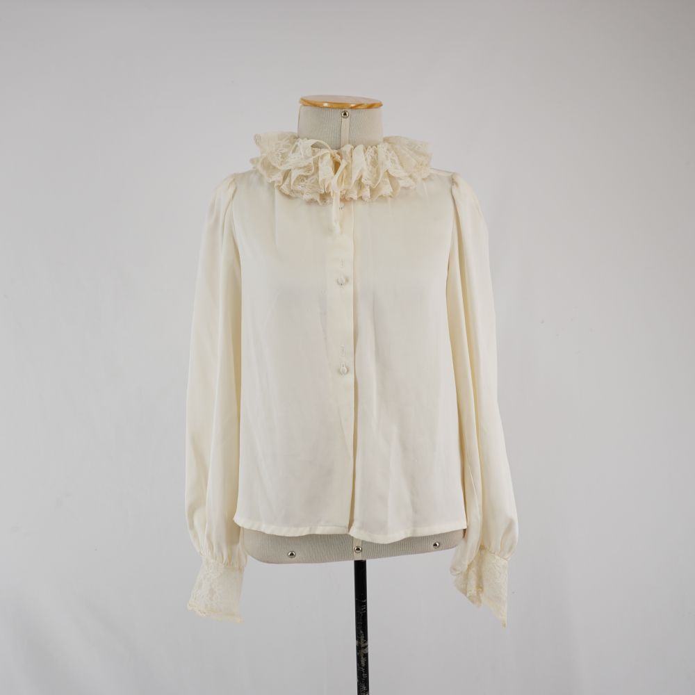 Camisa manga longa bufante off white, gola com babados de renda off white e punho com a mesma renda, fechamento em fita de cetim botão de pressão e...