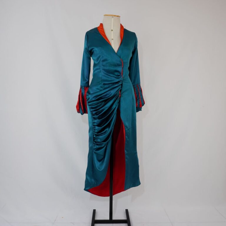 by Michelle Araujo Leia Mais...Casaco midi, turquesa, punho bufante com fendas vermelhas, gola laranja, frente drapeada com fechamento frontal em botão de pressão, forro vermelho.