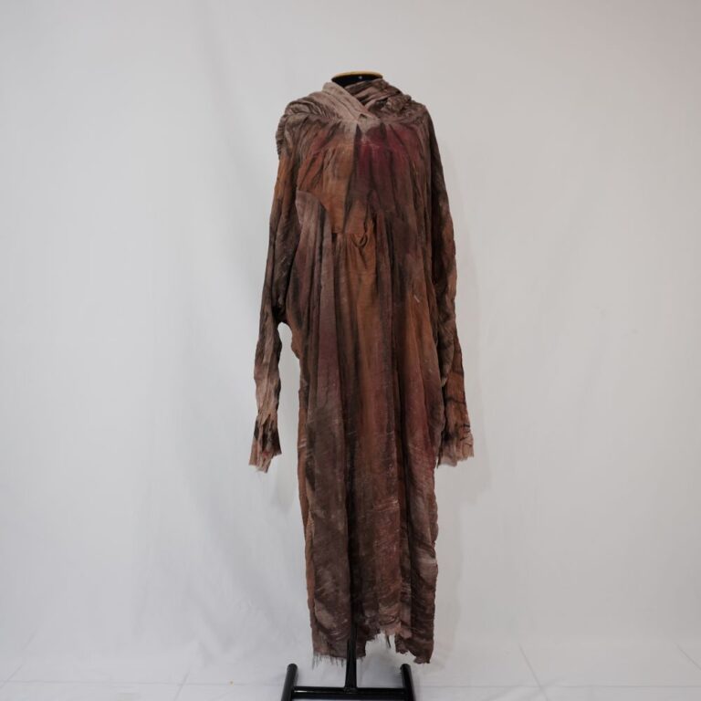 by Michelle Araujo Leia Mais...Vestido longuete com manga longa morcego e capuz, tecido texturizado tingido em tons de marrom
