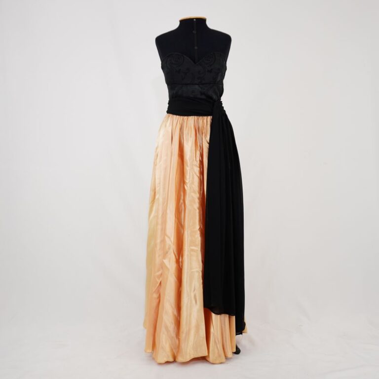 by Michelle Araujo Leia Mais...Vestido preto e dourado tomara que caia, top preto, saia dourada rodada e faixa na cintura