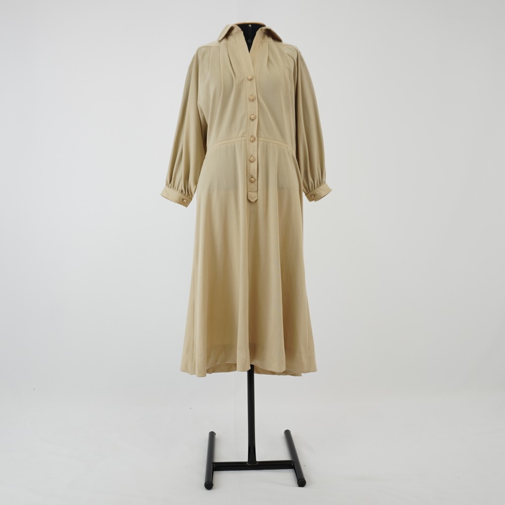 by Michelle Araujo Leia Mais...Vestido bege midi, manga três quartos com modelagem morcego e fechamento no punho com botão e franzido, modelagem evasê, gola arredondada, seis pregas macho frontais na parte superior...