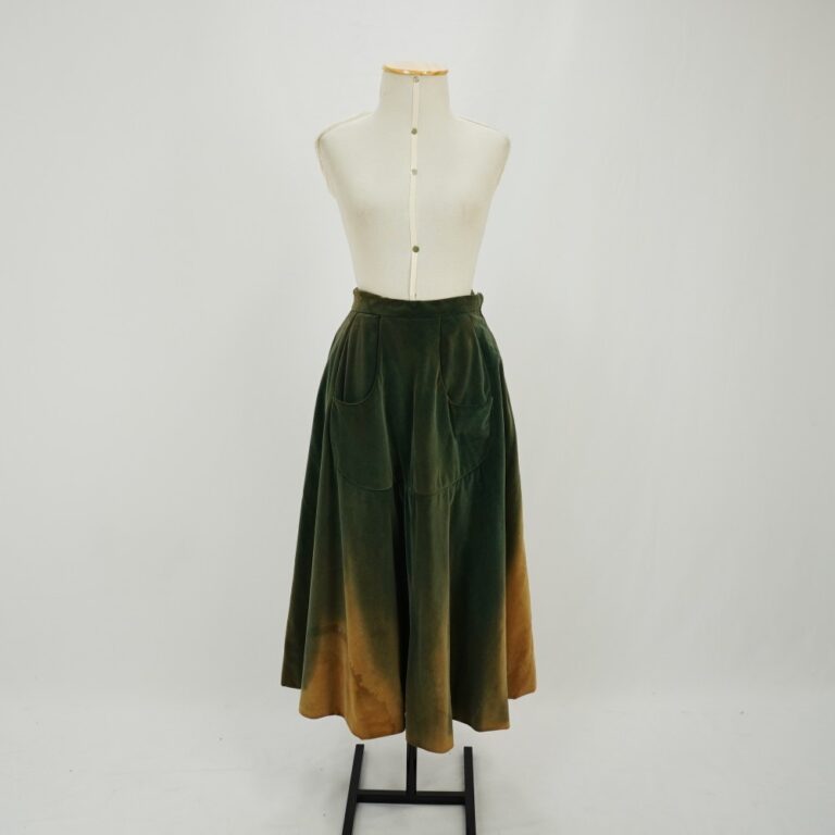by Michelle Araujo Leia Mais...Saia ampla de veludo verde com bolso frontal. Forro preto. Fechamento lateral por zíper e colchetes.