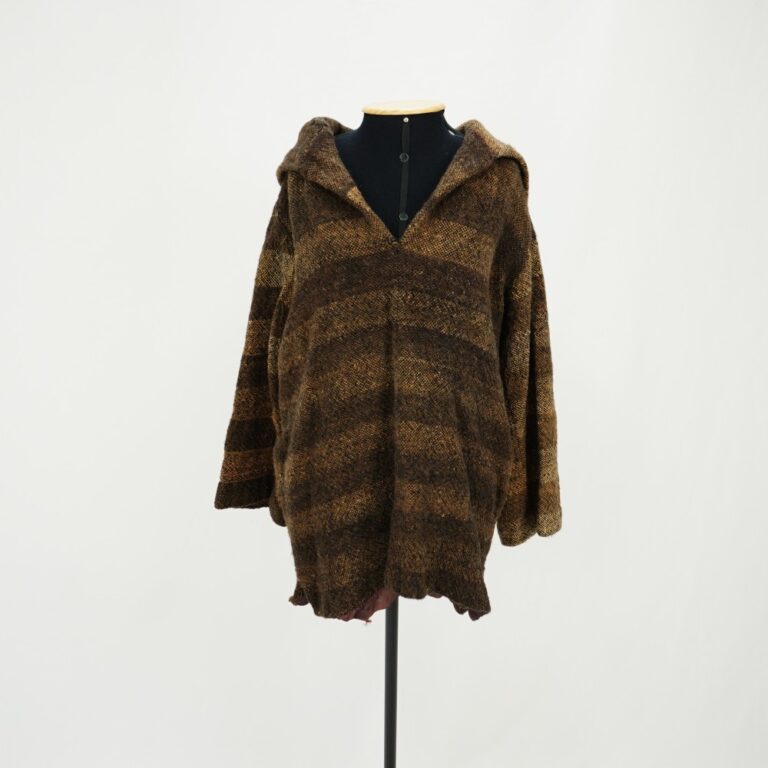 by Michelle Araujo Leia Mais...Casaco de listras horizontais nas cores marrom, bege e preto com capuz. Decote em “V”, bolsos laterais e forro de acabamento na barra interna. Fendas laterais na barra.
