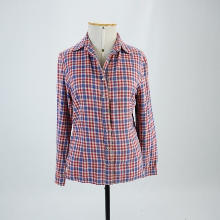 by Michelle Araujo Leia Mais...Camisa de flanela com padronagem xadrez nas cores bege, creme, rosa e azul. Fechamento com seis botões de madrepérola e um botão em cada punho. Possui seis pences,...