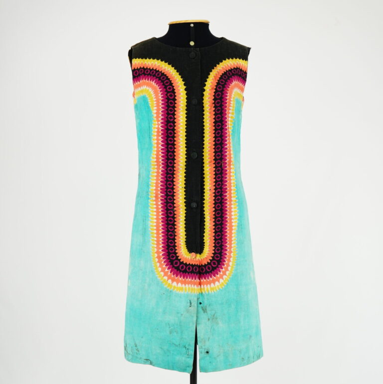 agosto 22, 2025 by Michelle Araujo Leia Mais...Vestido verde água midi de manga curta,com estampas em preto, coral, magenta, amarelo e branco e fechamento frontal com botão de pé forrado e botão de pressão