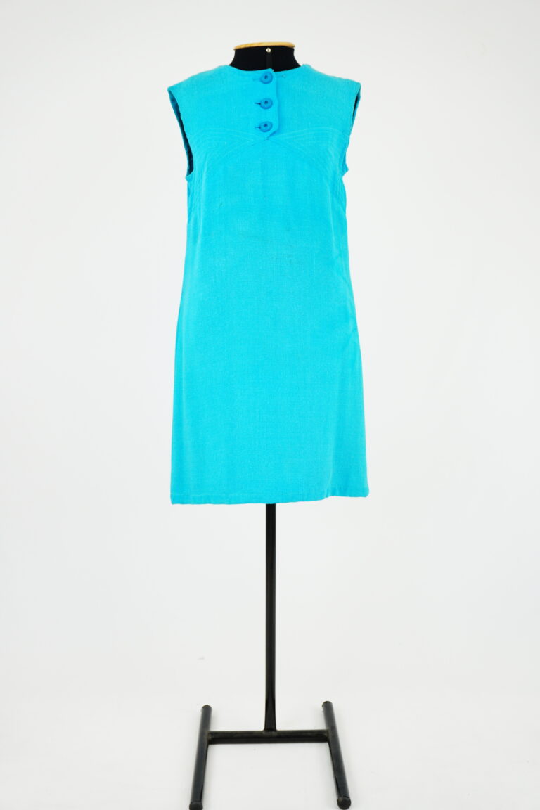 Vestido azul claro midi sem mangas, com detalhes no busto em pesponto e fechamento frontal