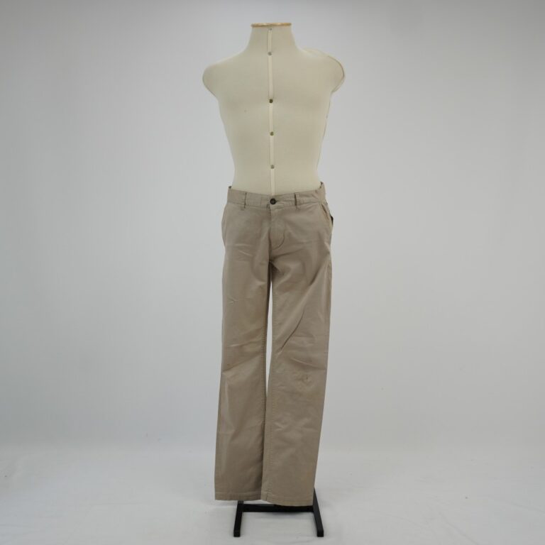 by Michelle Araujo Leia Mais...Calça reta bege com três bolsos frontais e dois bolsos traseiros embutidos com aba. Cinco passantes no cós, fechamento com zíper e botão metálico