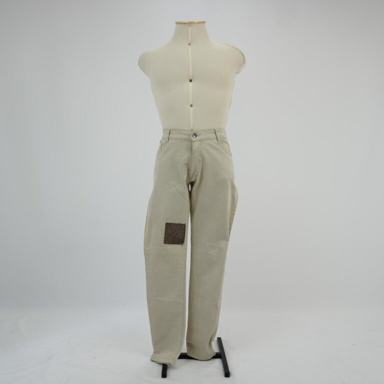 by Michelle Araujo Leia Mais...Calça slim bege com cinco bolsos, sendo três frontais e dois traseiros, cinco passantes no cós. Fechamento com zíper e botão de metal, detalhe na aplicação quadrada de...