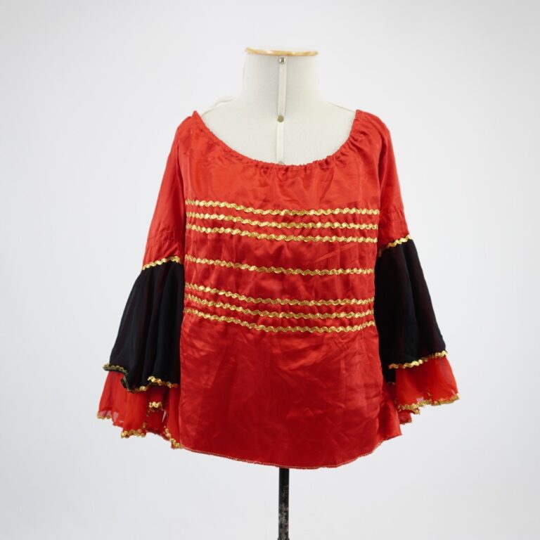 by Michelle Araujo Leia Mais...Blusa vermelha decote canoa com elástico, manga com duas camadas de babado, uma preta e uma vermelha, costas da blusa franzida e aplicação de sianinha dourada nas extremidades...