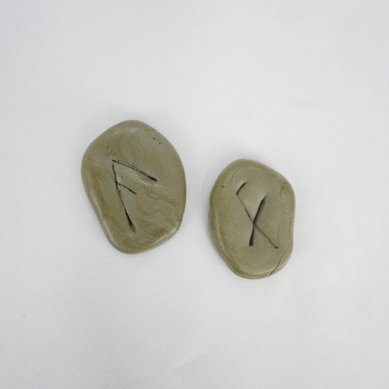 by Michelle Araujo Leia Mais...Duas pedras falsas de runas cinza esverdeado. Cada uma com símbolos característicos das runas dos dois lados.