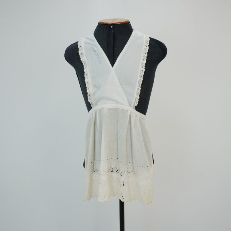 by Michelle Araujo Leia Mais...Avental de tecido plano branco com barrado inglês, três pregas de cada lado da peça e parte superior transpassada, possuí barrado de bordado inglês e amarração na cintura
