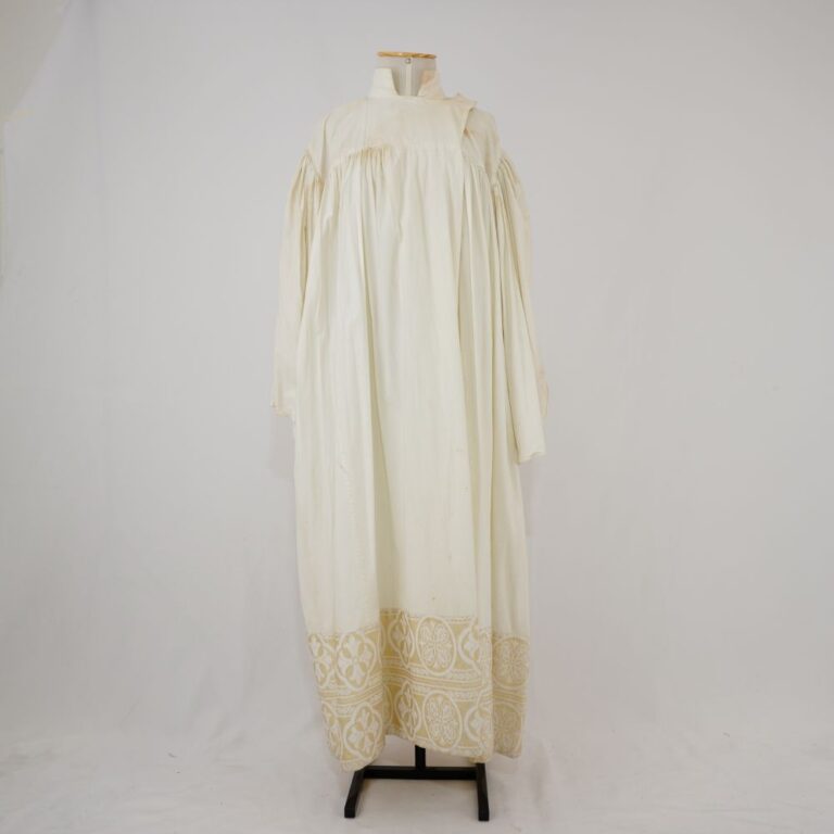 by Michelle Araujo Leia Mais...Vestido/túnica longo com mangas longas amplas, franzido na cava, offwhite, gola alta, fechamento com transpasse em velcro em ambaos os ombros, barra em jacquard creme com dourado