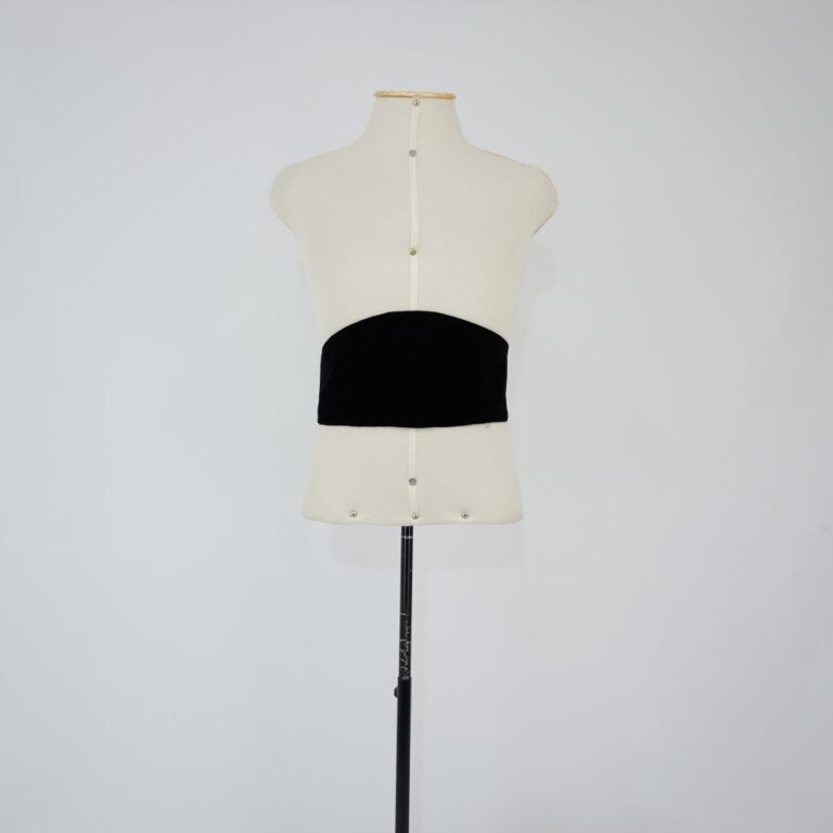 Cinto em veludo preto, com centro da frente mais largo e fechamento em velcro nas costas