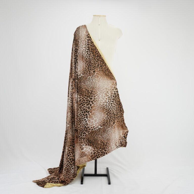 Túnica dupla face longa de um ombro só com estampa de oncinha nas cores preto, marrom, bege e branco e parte interna em lamê dourado. No ombro a...