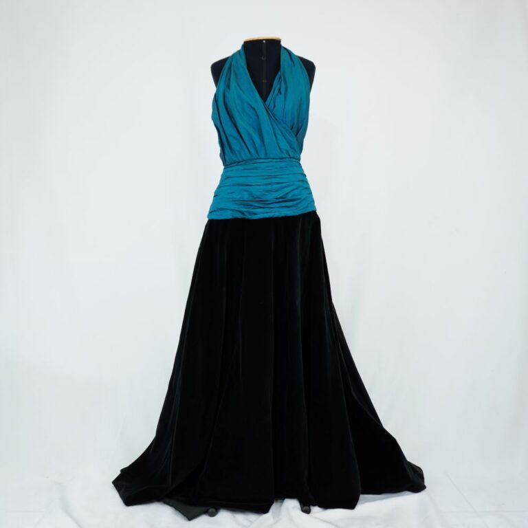 Vestido longo frente única, busto transpassado com cintura drapeada em tafetá turquesa, saia de veludo godê preta, fechamento em colchete no pescoço e lateral com zíper e colchete,...