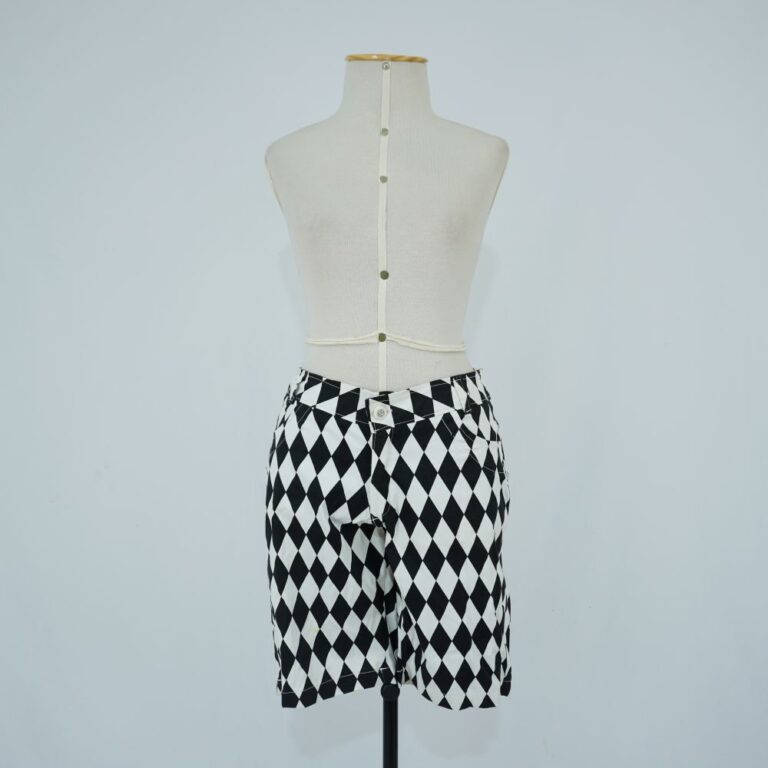 by Michelle Araujo Leia Mais...Bermuda preta e branca, cós de calça com passador, botão e zíper. Dois bolsos falsos na frente e dois bolsos pequenos atrás. Estampa de losangos em preto e...
