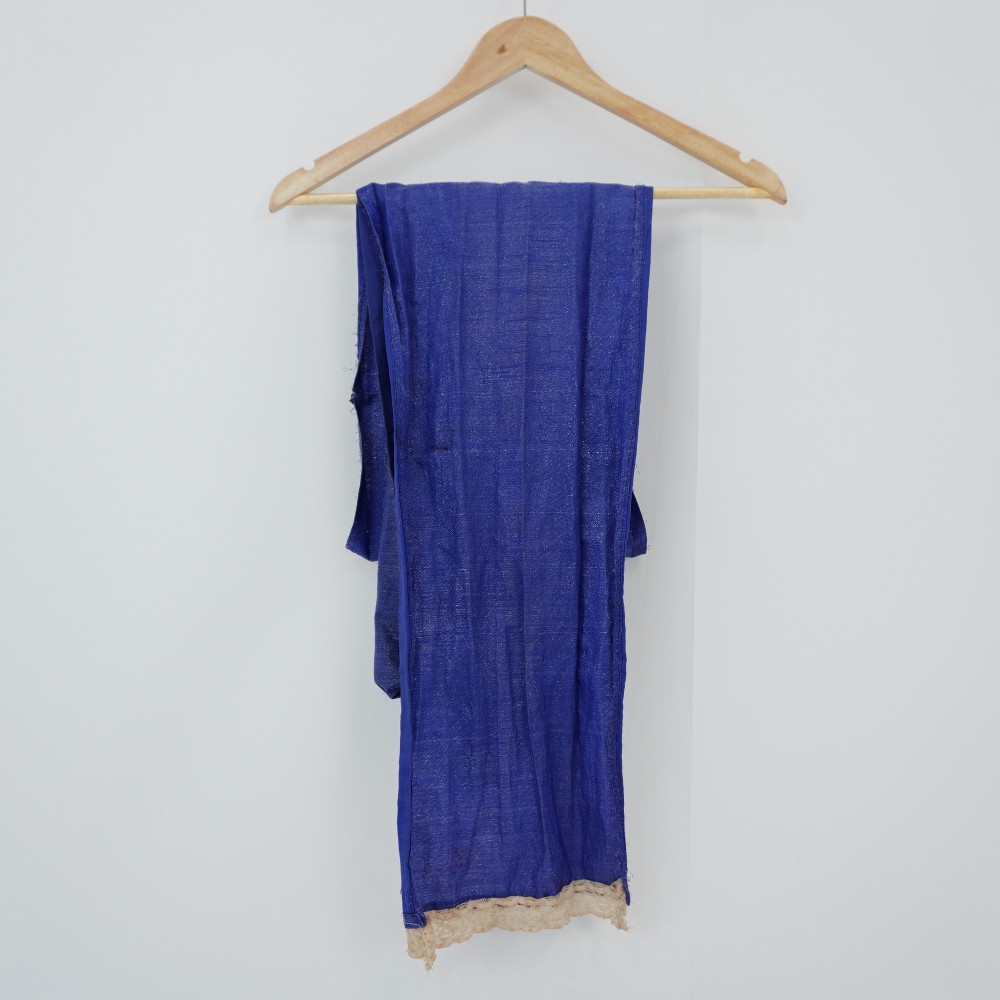 Faixa retangular em azul com brilhos para amarração. Duas costuras de recortes, barras das extremidades em renda.