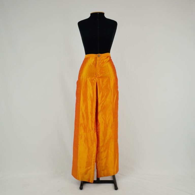 by Michelle Araujo Leia Mais...Calça reta dourada com vincos frontais, cós estreito