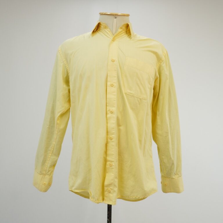 by Michelle Araujo Leia Mais...Camisa amarela de manga longa. Possuí bolso do lado esquerdo frontal, oito botões frontais, três botões em cada punho, dois botões no colarinho interno. Barra abaulada e duas...