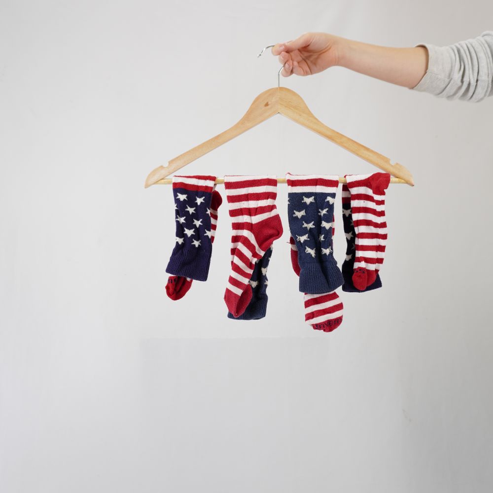 by Michelle Araujo Leia Mais...Par de meias cano longo com listras vermelhas e brancas, no cano fundo azul com estrelas brancas