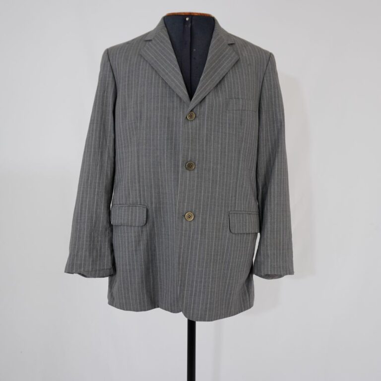 by Michelle Araujo Leia Mais...Blazer cinza com linhas brancas e azuis, três bolsos frontais e dois bolsos na parte de dentro, forro cinza